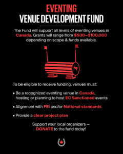 Equestrian Canada and the Eventing High Performance Advisory Group are excited to announce the launch of the Eventing Venue Development Fund. The fund has been established to support the development and improvement of eventing venues across Canada. Funds raised will go to support both FEI-sanctioned competition venues as well as national competition venues. The goal of the fund is to enhance Canadian facilities to meet international standards, improve Canadian athlete competitiveness on the world stage, provide exciting spectator experiences and encourage the growth of eventing within the country.