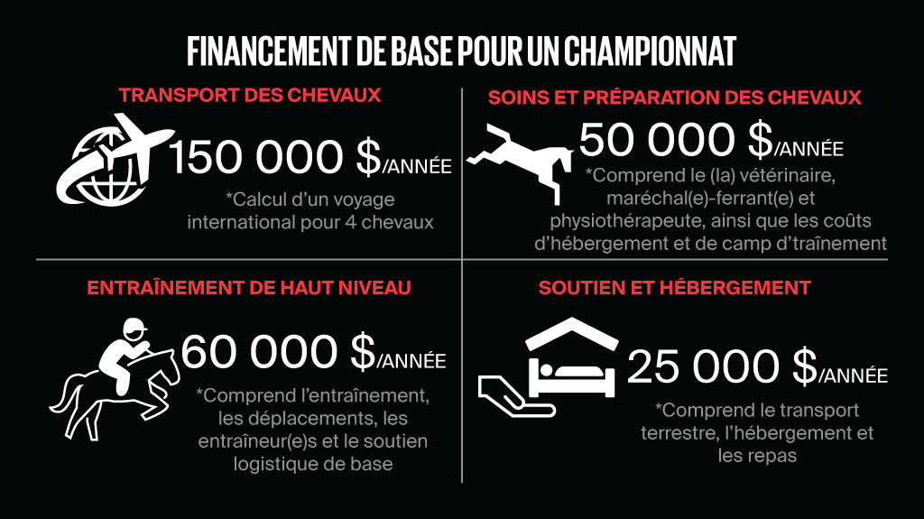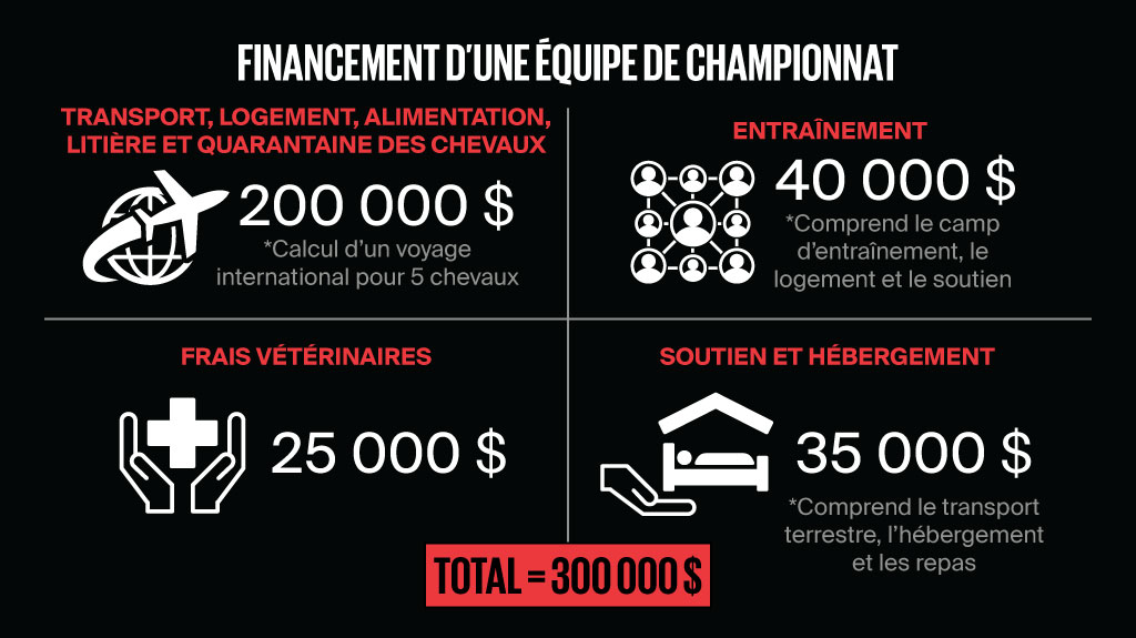 Contrairement à d’autres pays, le Canada dispose de très peu de fonds pour le concours complet de haut niveau. Nous manquons de ressources pour fournir tout ce dont nos athlètes ont besoin pour exceller à l’international. Les nombreux frais comptent notamment les déplacements, les soins vétérinaires, la logistique, le soutien technique et le développement de cheminements pour les athlètes afin de leur assurer une longue carrière.