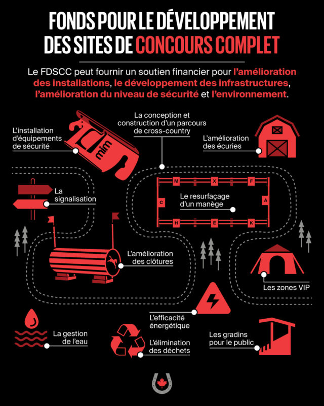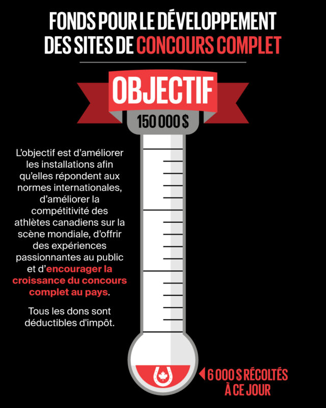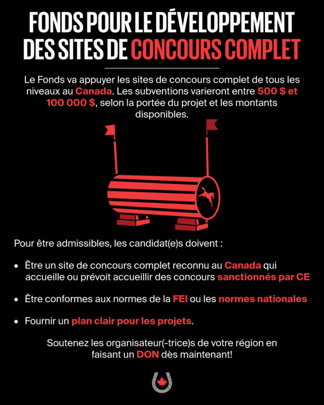 Canada Équestre et le groupe consultatif sur le concours complet de haut niveau sont ravis d’annoncer le lancement du Fonds pour le développement des sites de concours complet. Ce fonds appuie le développement et l’amélioration des sites de concours complet au Canada. Les fonds recueillis serviront à soutenir les sites de concours FEI ainsi que les sites de concours nationaux. L’objectif est d’améliorer les installations afin qu’elles répondent aux normes internationales, d’améliorer la compétitivité des athlètes canadiens sur la scène mondiale, d’offrir des expériences passionnantes au public et d’encourager la croissance du concours complet au pays.
