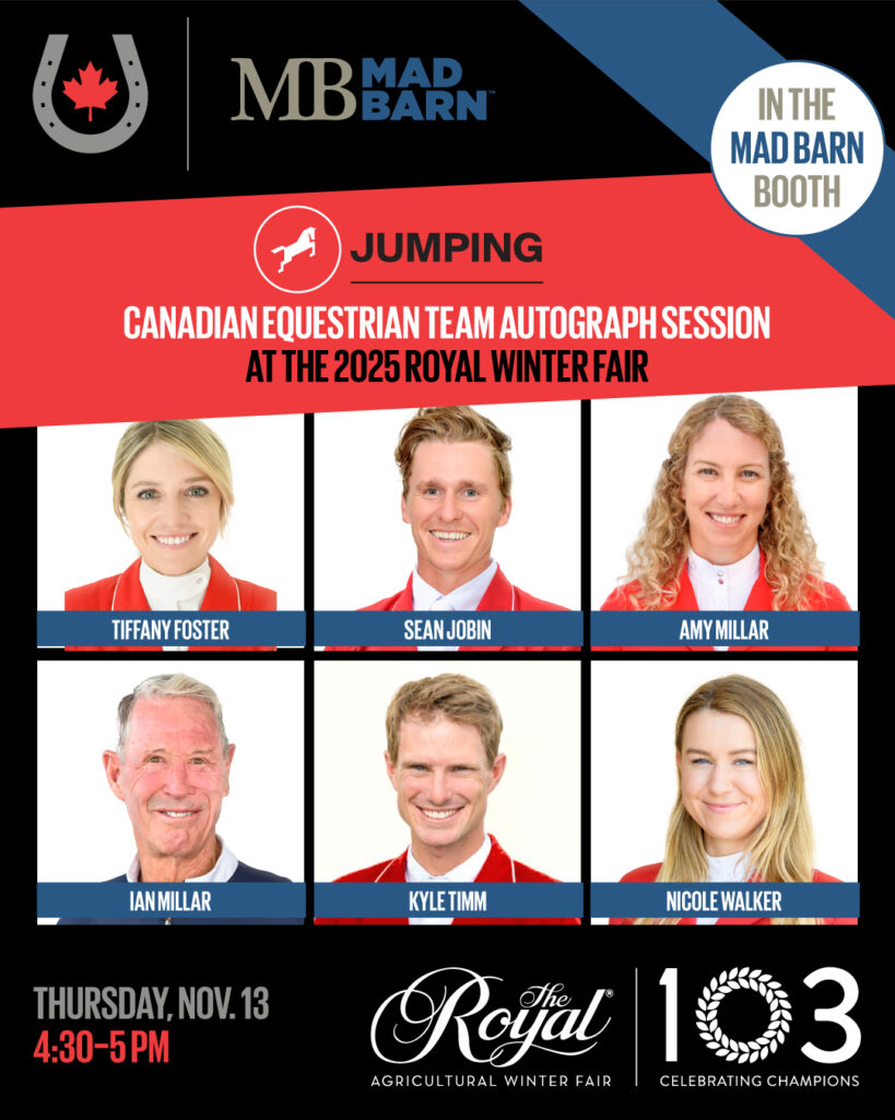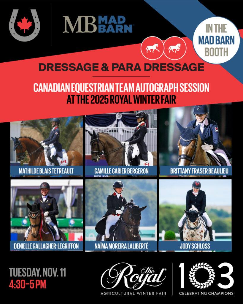Come meet & greet Canadian Equestrian Team riders at the Mad Barn Booth during the Royal! We welcomed the Eventers Saturday, November 8, including very special guest world number-one ranked Harry Meade (GBR). Tuesday, November 11 features our Dressage and Para Dressage riders from 4:30-5:00pm and Thursday, November 13 will be the Show Jumpers again from 4:30-5:00pm. Don’t miss this chance to get autographs and photos with our Olympic and Paralympic riders, and have your questions answered (and grab great swag!) at the booth of our Official Nutrition Partner Mad Barn at the same time.