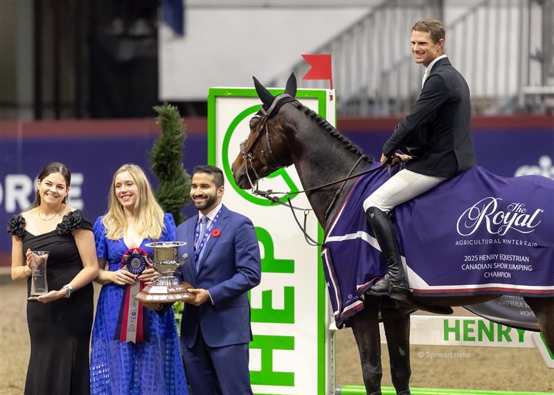 Kyle Timm of Calgary, AB, and Atomica des Sequoias Z are presented as the 2025 Canadian Show Jumping Champions by L-R Stephanie LeBlond, Board of Directors, Equestrian Canada; Meghan Mackenzie Bell, Assistant Vice President Sales and Business Development, Henry Equestrian and Agri Personal Risk and Small Business Insurance; and Cyrus K. Cooper, CEO of the Royal Agricultural Winter Fair.