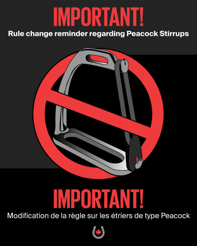 Equestrian Canada is reminding all hunter/jumper sport licence holders, coaches, officials, and competition organizers that traditional peacock safety stirrups are prohibited as per the rule change to Section G202.13 and G1005.5 at all competitions effective January 1, 2026.